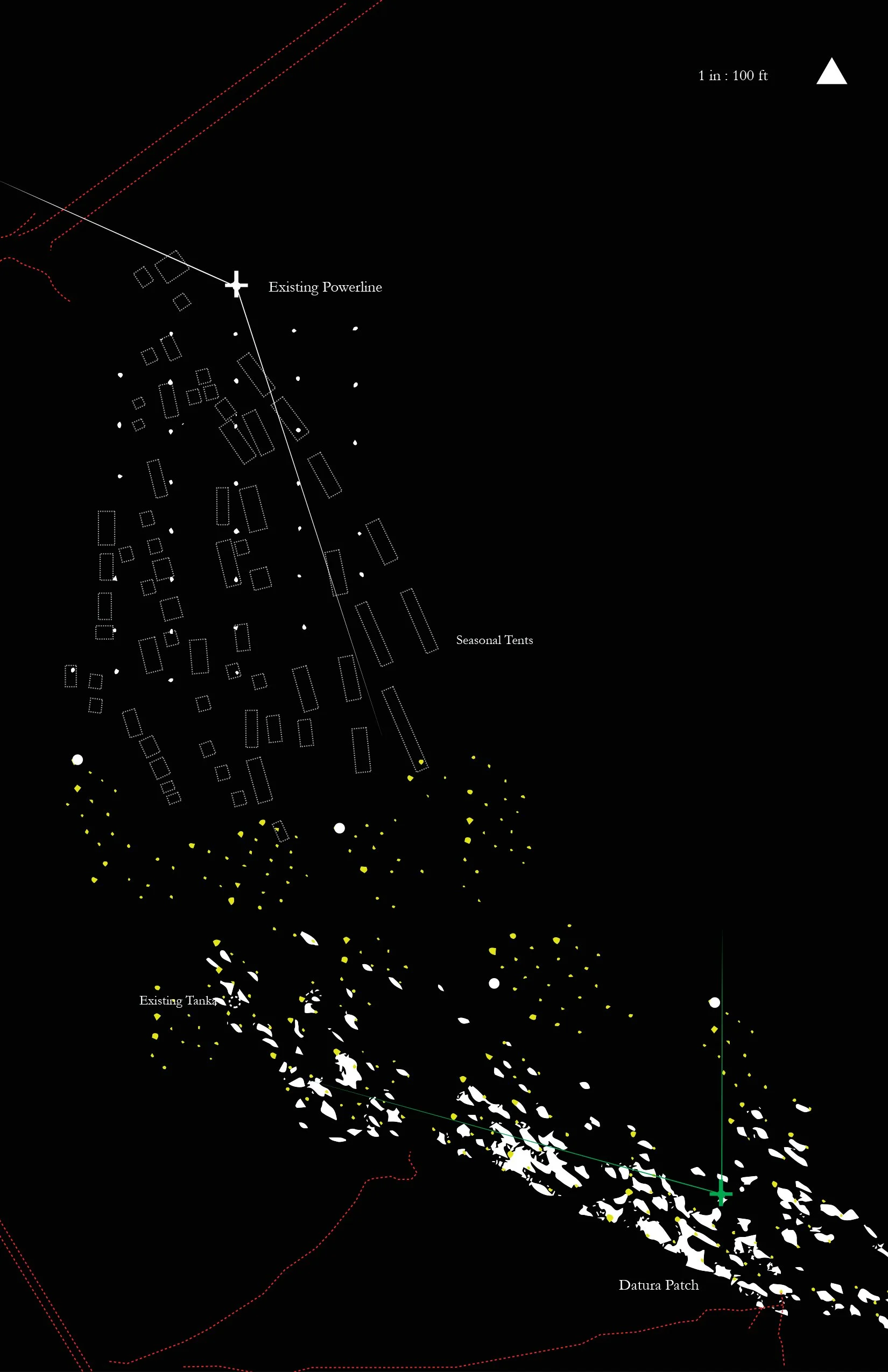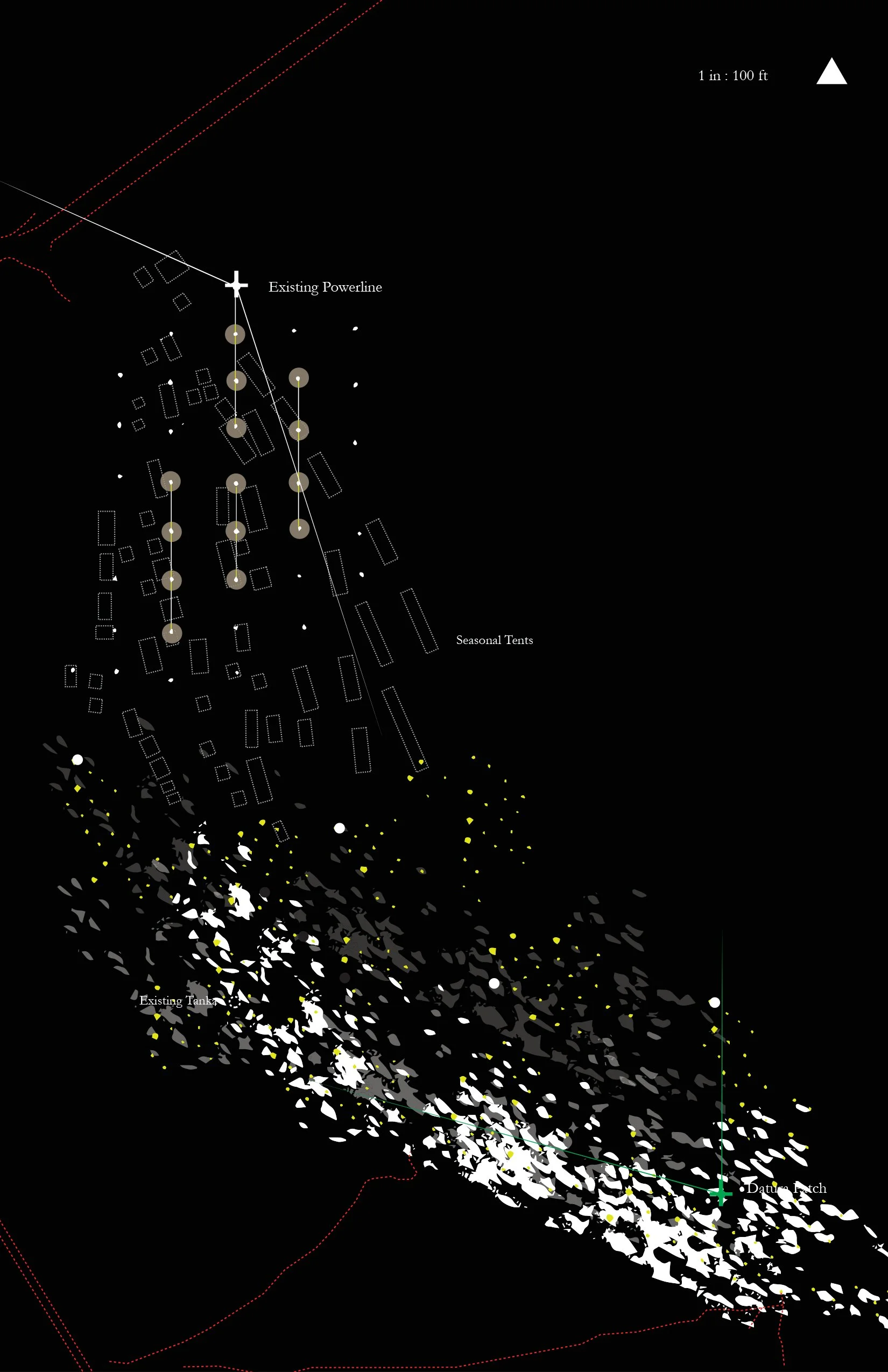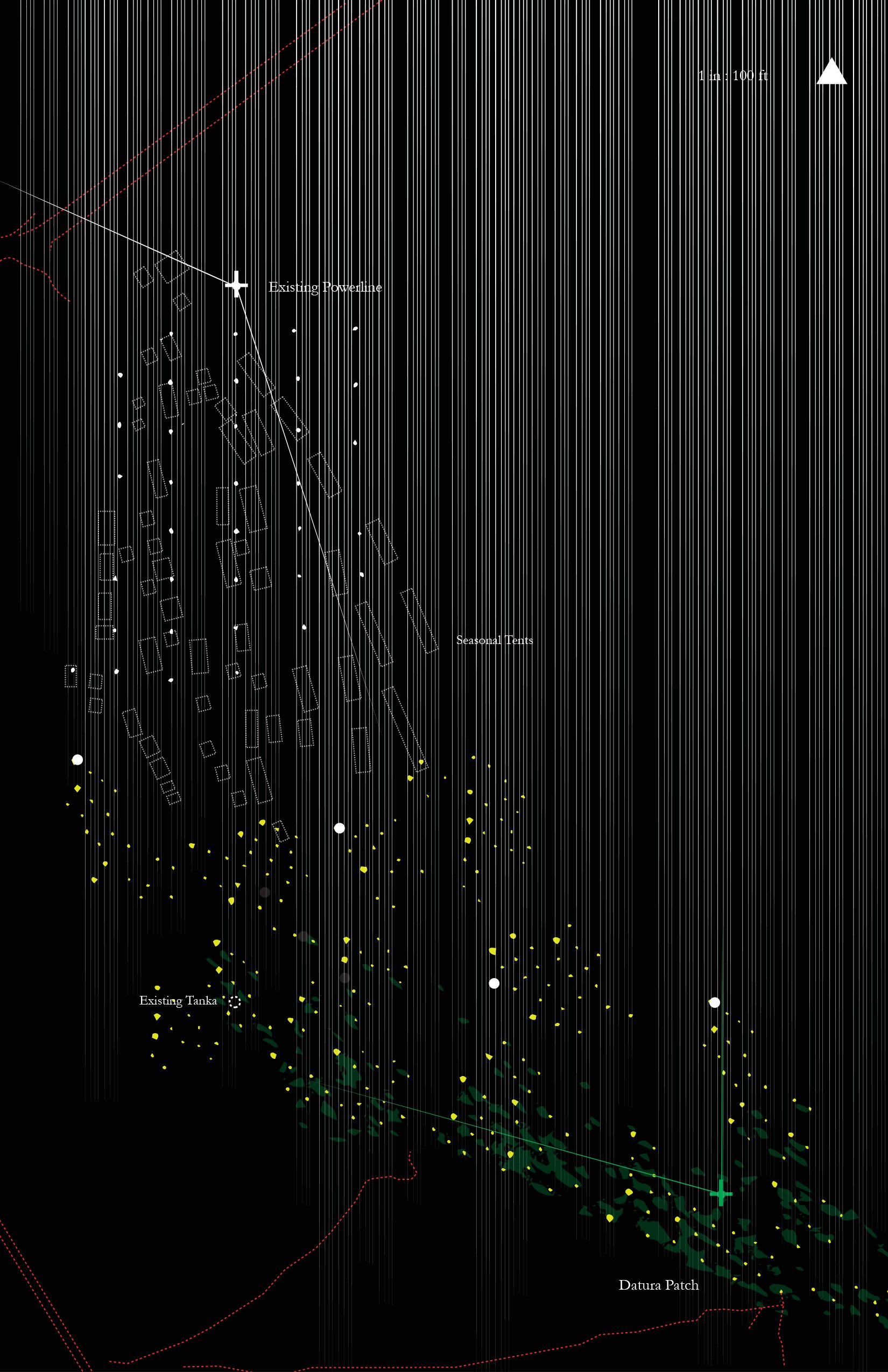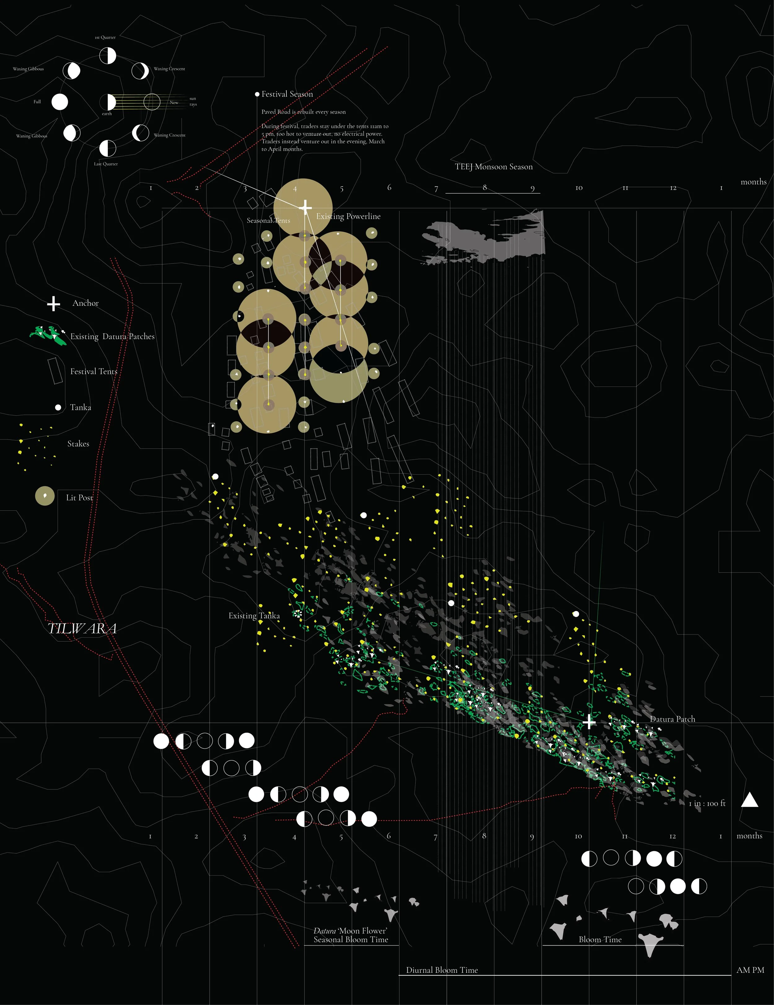 The work maps the river’s seasonal cycles—tracing existing conditions across periods of drought, occupation, and, monsoon transformation called Teej. It documents the annual trade fair in March, when the riverbed is dry and fully traversable; the introduction of light post structures as markers within the landscape; the emergence of datura (moonflower) plantings blooming from April through June; and the monsoon season in July and August, when the river swells and becomes uncrossable.