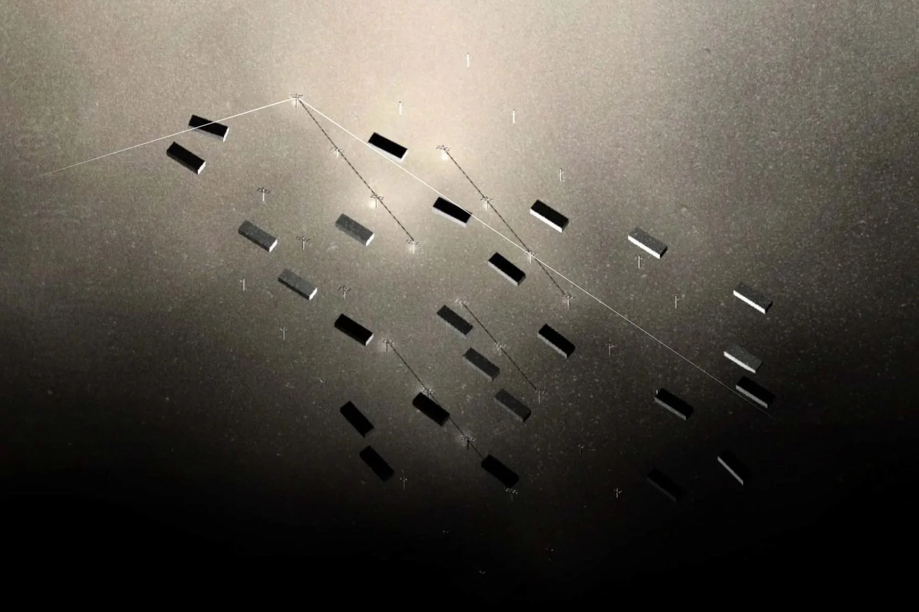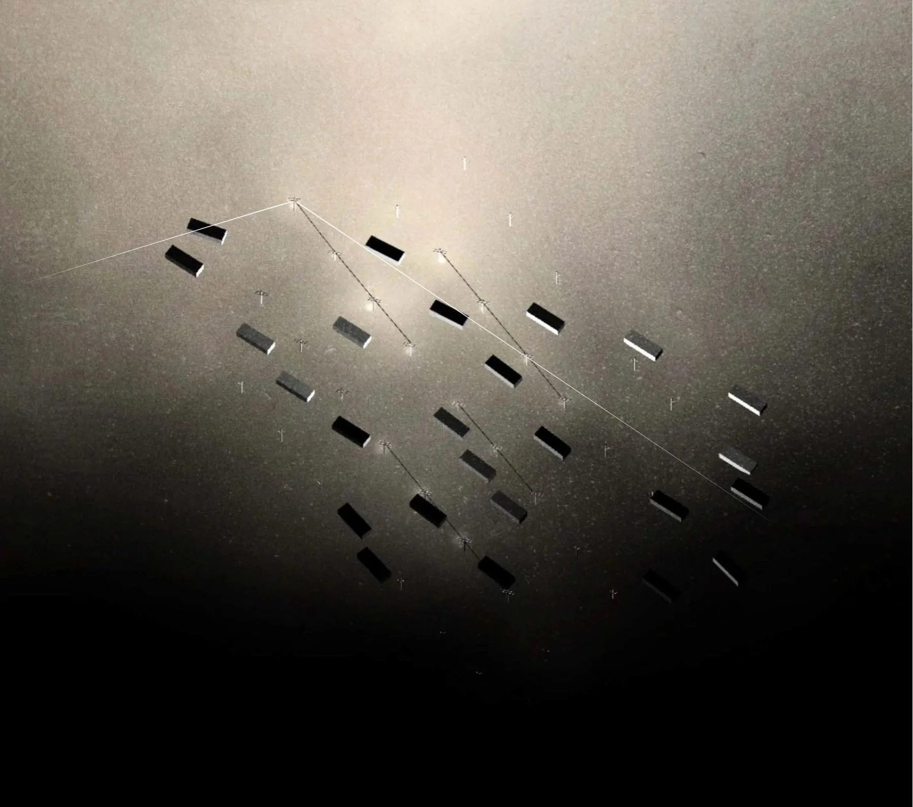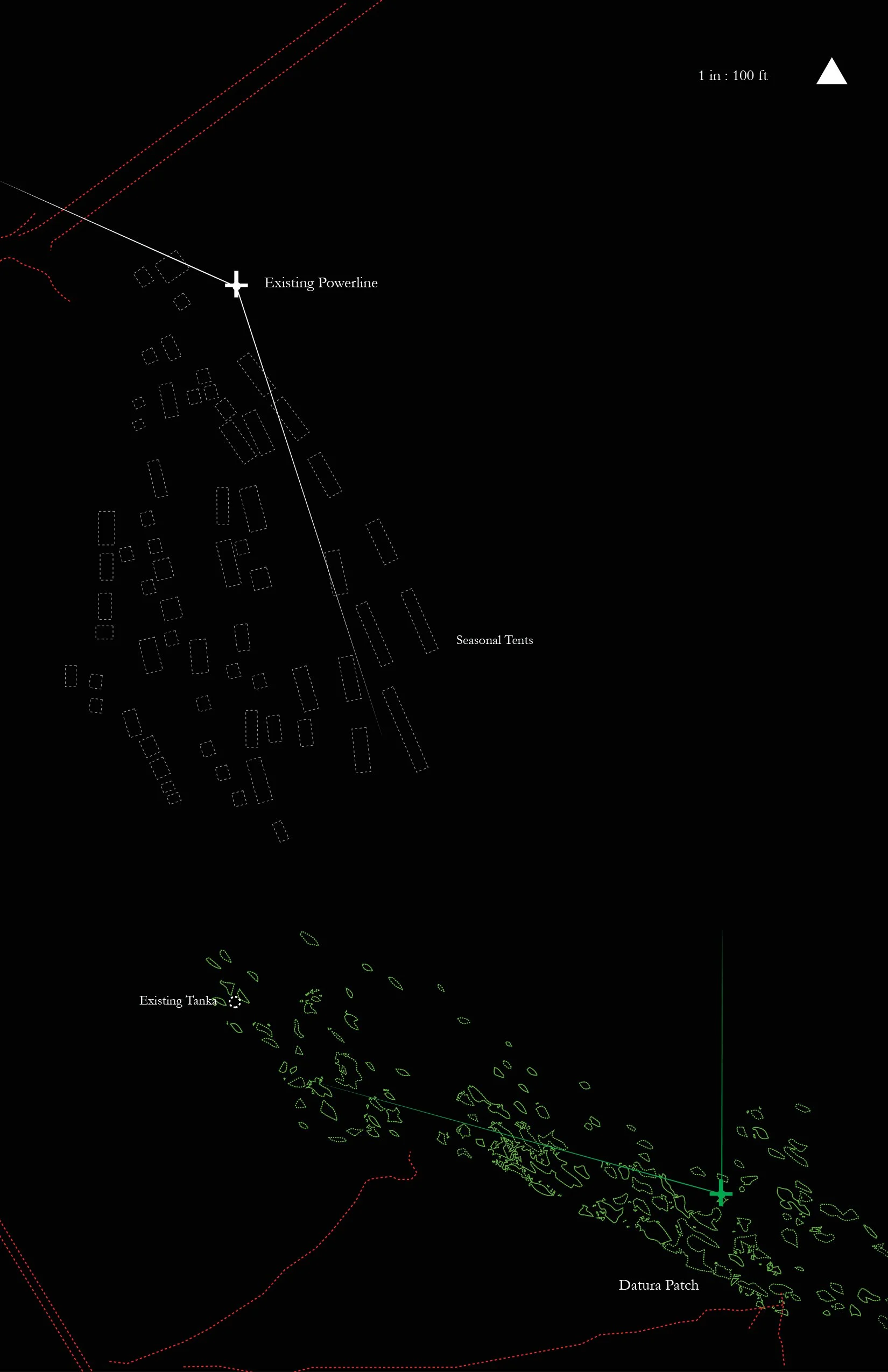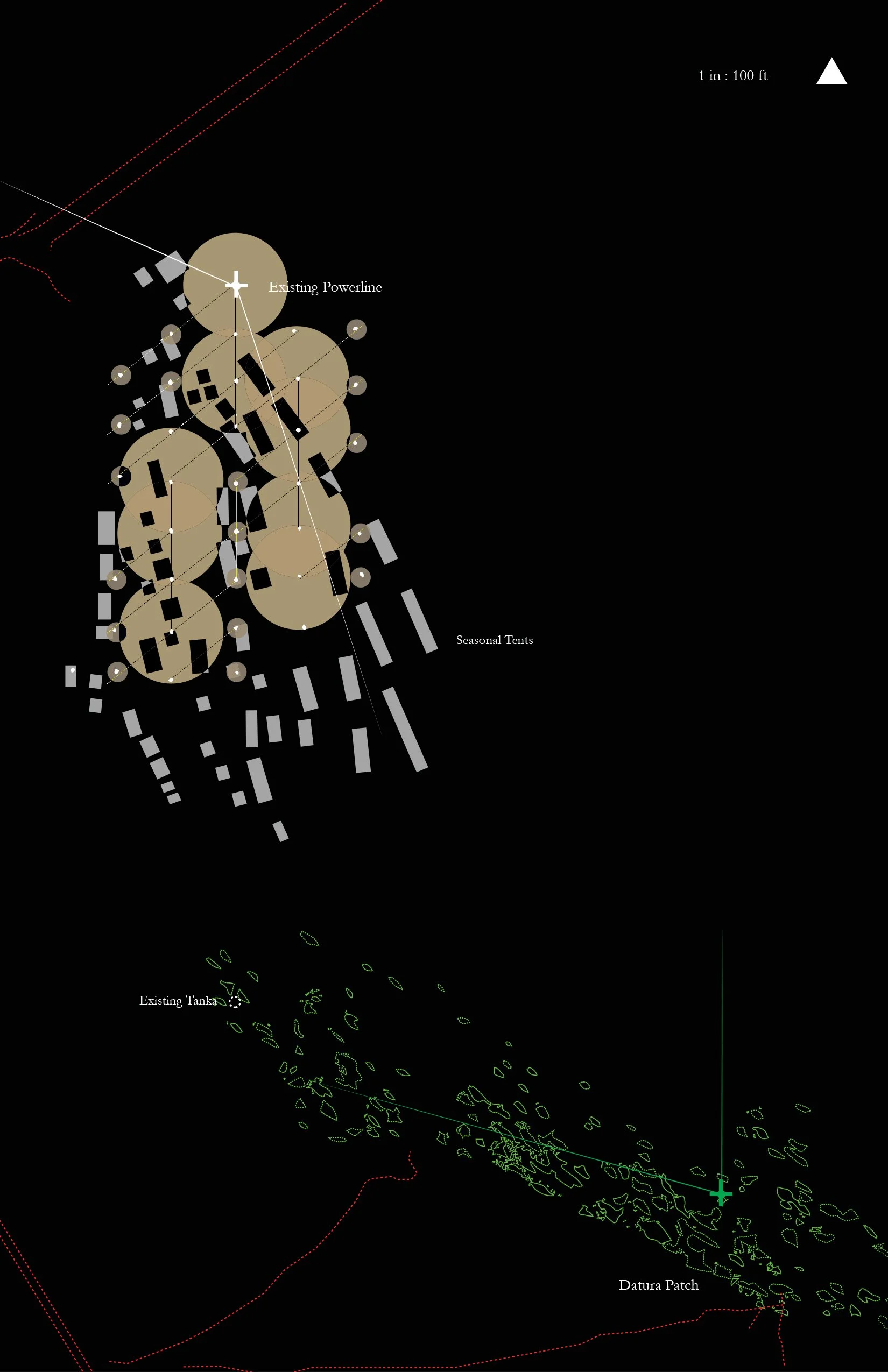 The work maps the river’s seasonal cycles—tracing existing conditions across periods of drought, occupation, and, monsoon transformation called Teej. It documents the annual trade fair in March, when the riverbed is dry and fully traversable; the introduction of light post structures as markers within the landscape; the emergence of datura (moonflower) plantings blooming from April through June; and the monsoon season in July and August, when the river swells and becomes uncrossable.