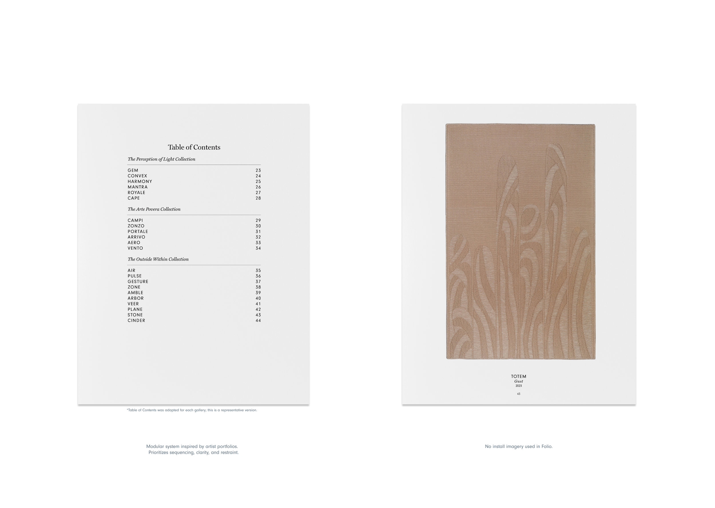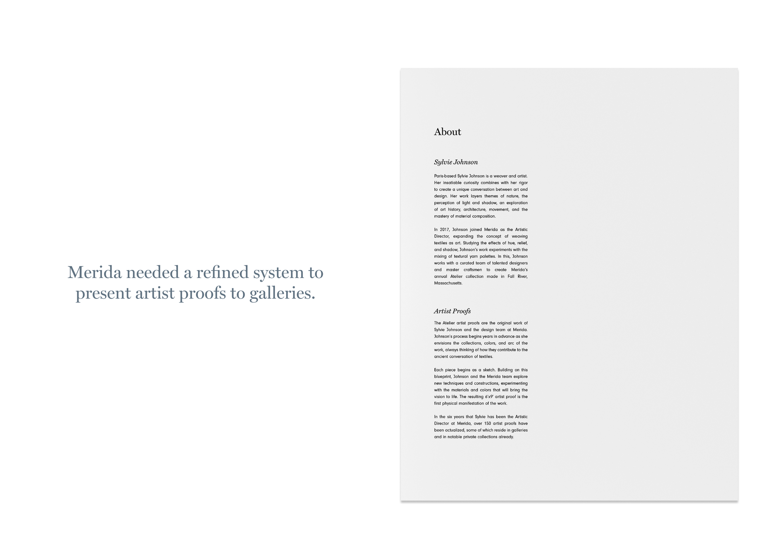 Flat-lay photography and generous white space echoing presentation style of traditional artist folios