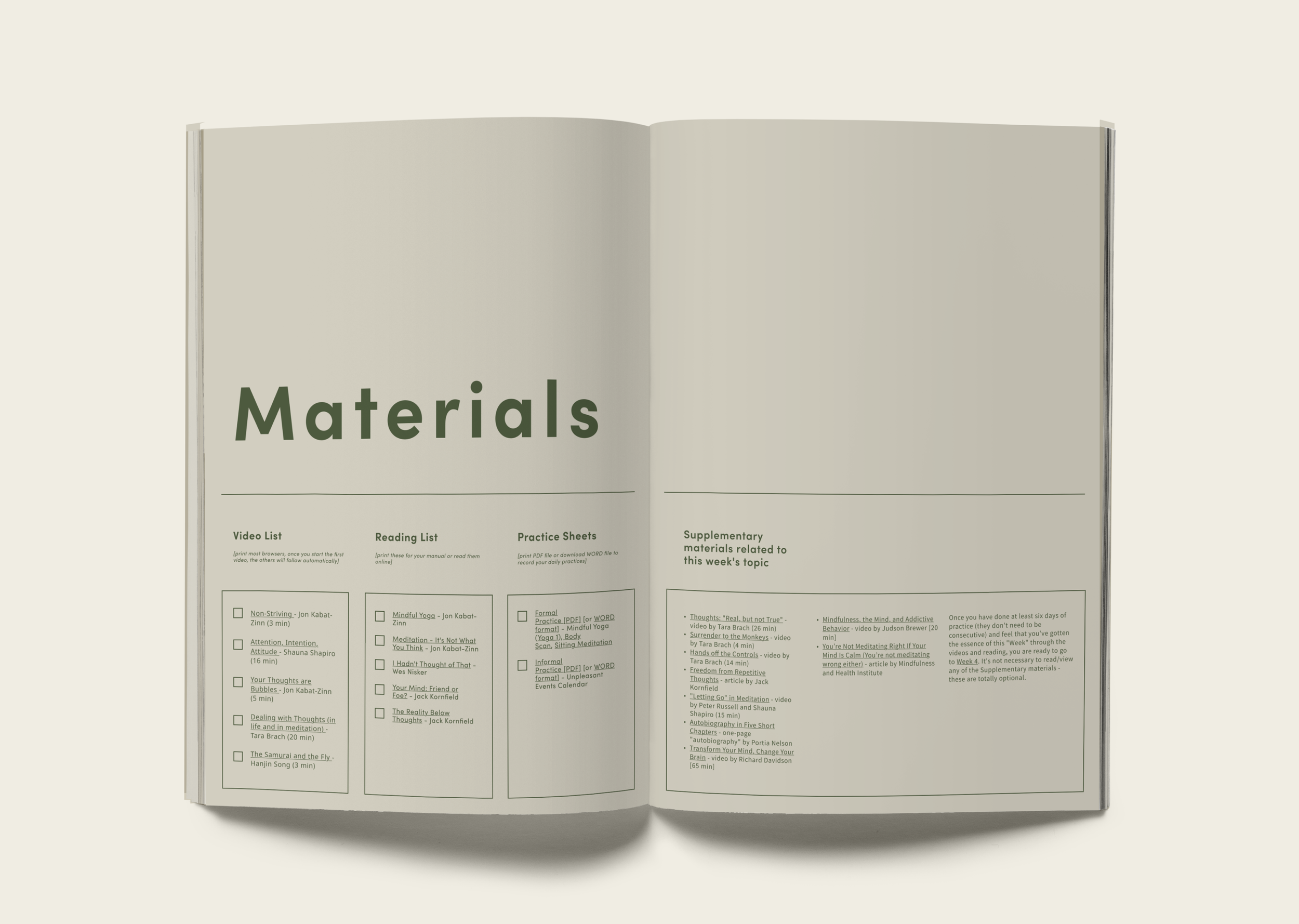 To support offline practice, I redesigned the downloadable MBSR manual as a companion resource, extending the experience beyond the screen and reinforcing long-term engagement.