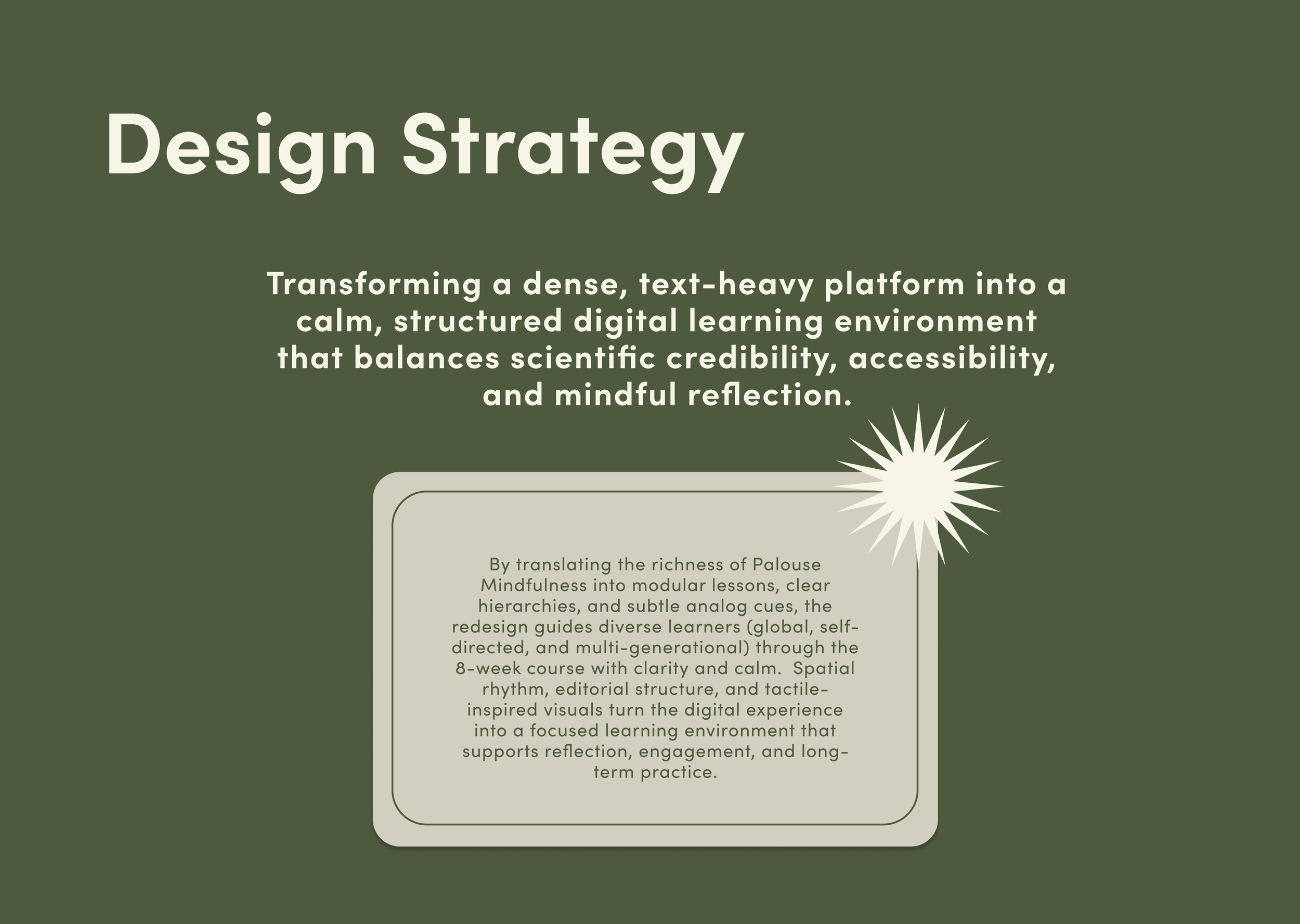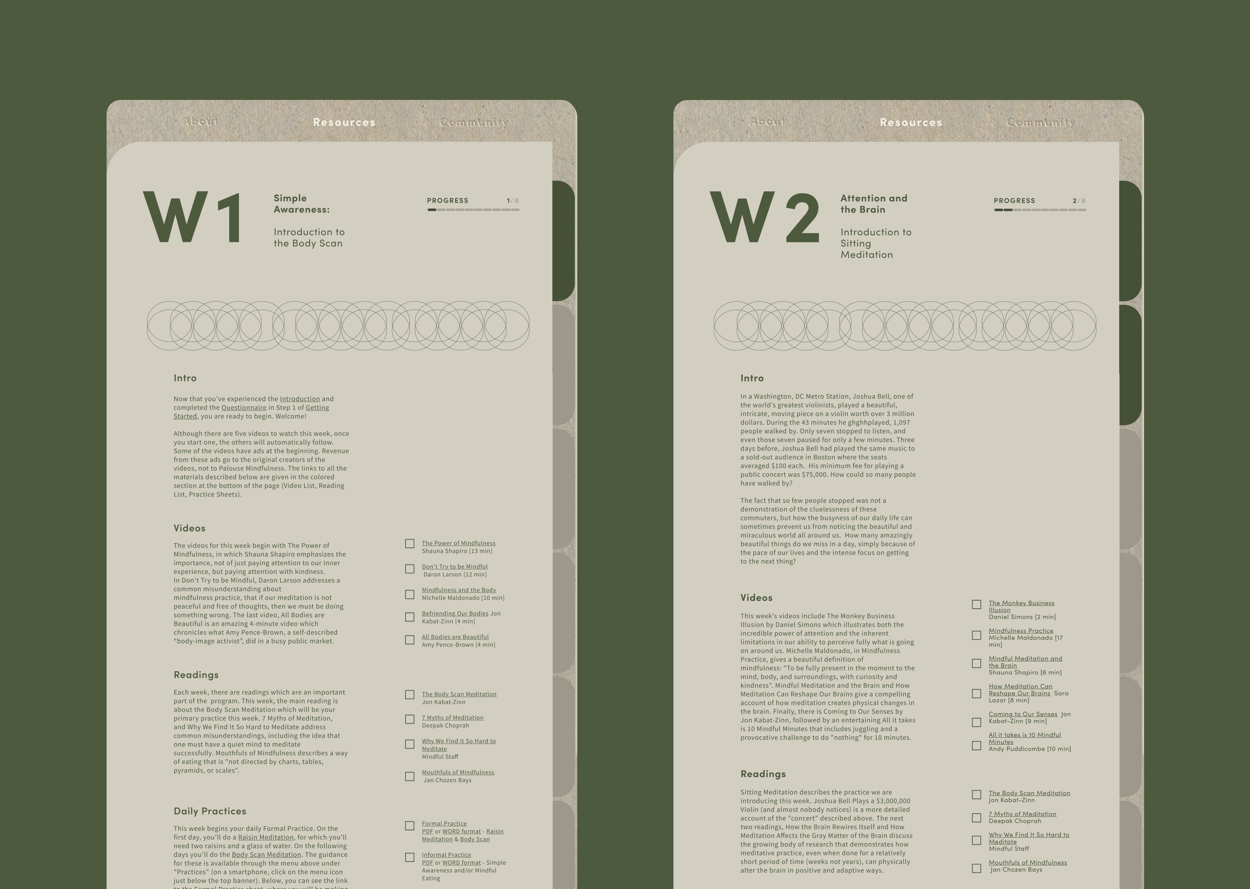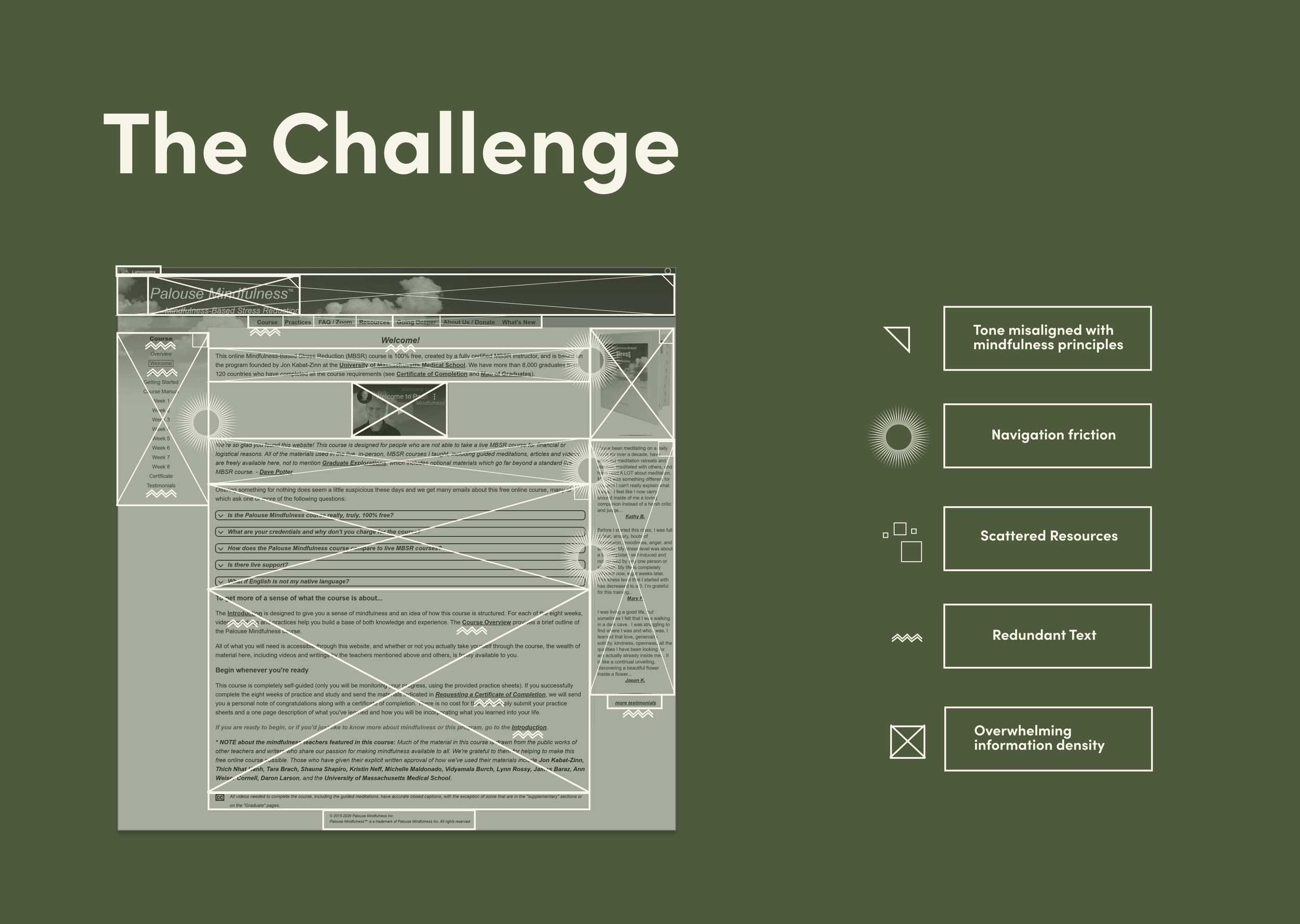 Palouse Mindfulness offers a free, 8-week online Mindfulness-Based Stress Reduction (MBSR) course, based on the program developed by Jon Kabat-Zinn. While widely respected in clinical settings, the existing platform was dense and difficult to navigate particularly for younger, digital-native users.